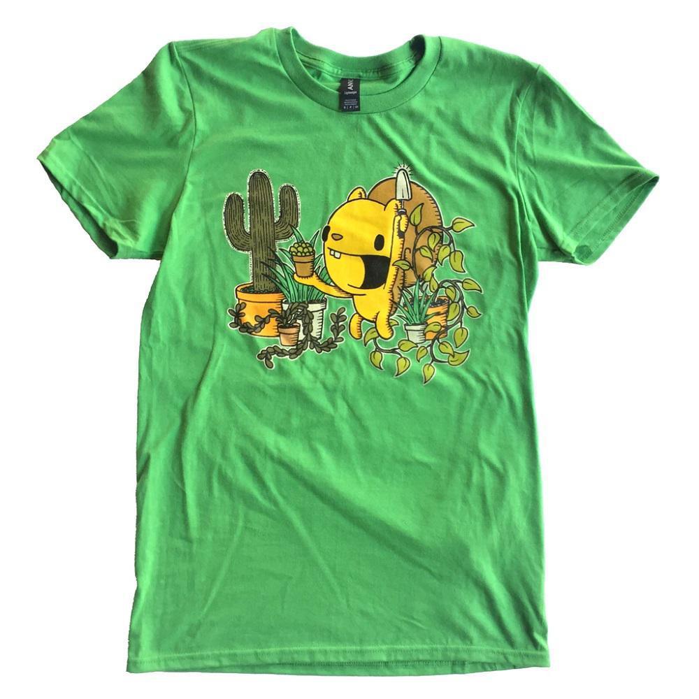 This adorable squirrel is excited about spring! Hand silk screened in off-white, green, brown, and black ink on a green background. The designs are heat set after printing to ensure durability. Shirt is made of 100% combed ringspun cotton and has a straight boxy shape with a standard crew neck and short sleeves.